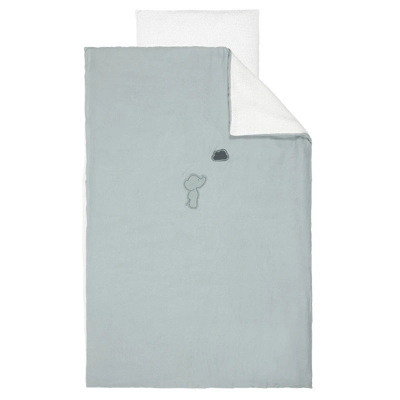 La housse de couette Luna & Axel de Nattou associe une face en plumetis clair, et l’autre unie vert sauge, décorée en son centre du ravissant éléphant Axel. Utilisée seule, elle couvre délicatement votre pitchoun quand il fait chaud, tout en laissant l’air circuler. Complétée d’une couette, vendue séparément, elle lui propose un cocon moelleux pour les nuits plus fraîches. Ajoutez un oreiller 40 x 60 cm (en option) dans la taie… Et hop, au lit !