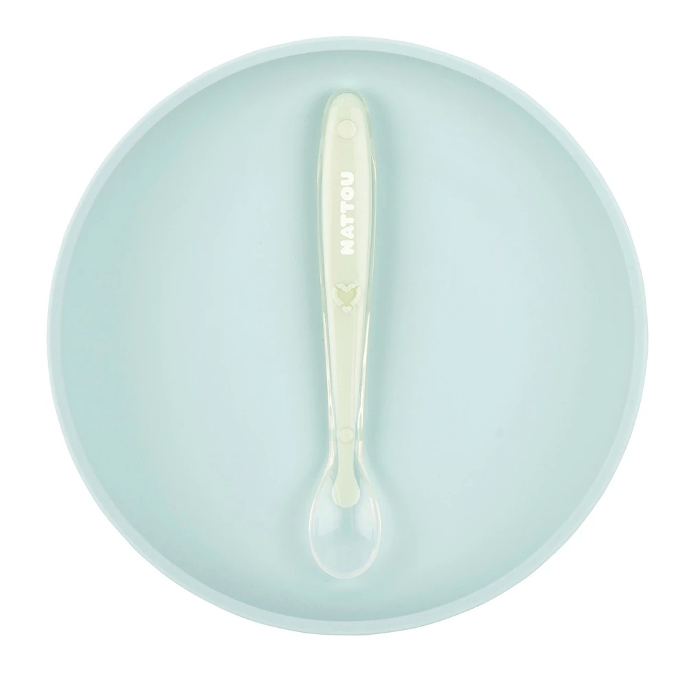 Assiette bébé + cuillère silicone bleu clair