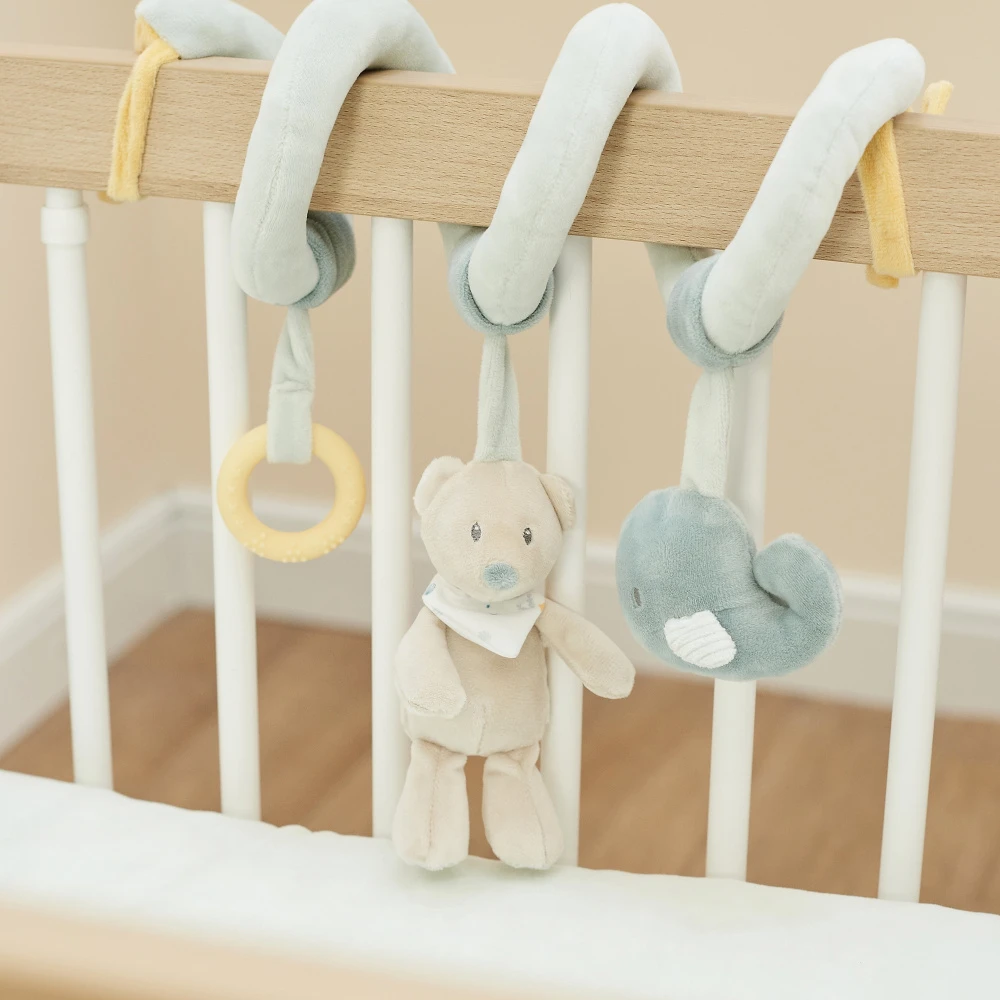 La Spirale d’activités roméo et jules de chez Nattou. La spirale, avec sa petite peluche et ses diverses activités, invite au jeu. Elle est facilement attachable au lit, au siège bébé.