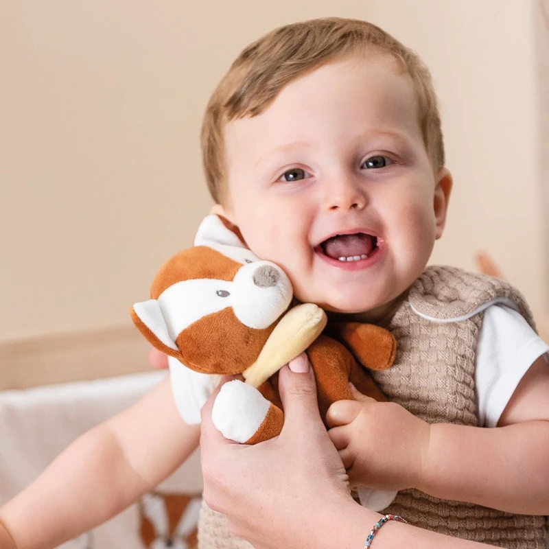La mini-peluche musicale Boris de Nattou est réalisée en velours de polyester tout doux, roux et blanc. Son corps souple, ses pattes fines et sa longue queue rendent l’animal facile à prendre en main pour un jeune enfant. Les liens sur son dos permettent de l’accrocher au bord du lit, du parc, à la poussette ou dans la voiture, si vous préférez.
