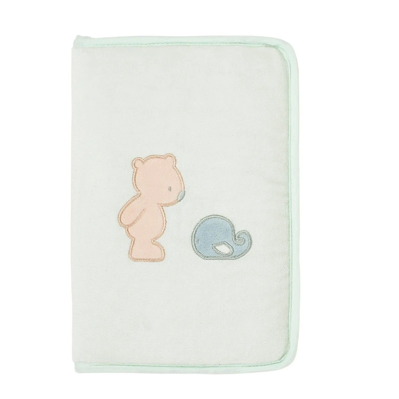 Le protège-carnet de santé Roméo, Jules & Sally de Nattou est réalisé en velours extra-doux d’une tendre nuance de vert. Il dispose d’une fermeture à glissière sur son pourtour qui retient précieusement à l’intérieur, le livret et tous les documents complémentaires que vous y rangez. Cette housse évite aussi qu’ils soient salis, pliés, déchirés ou perdus lors des multiples manipulations.